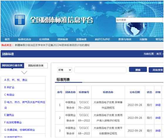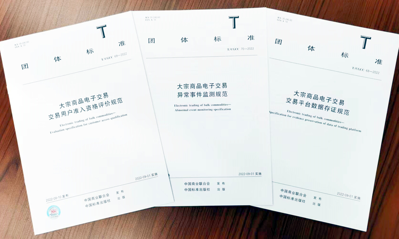 2022年9月28日,《大宗商品电子交易 交易平台数据存证规范》 (T/CGCC 68-2022) 、《大宗商品电子交易 交易用户准入资格评价规范》(T/CGCC 69-2022) 和《大宗商品电子交易 异常事件监测规范》(T/CGCC
