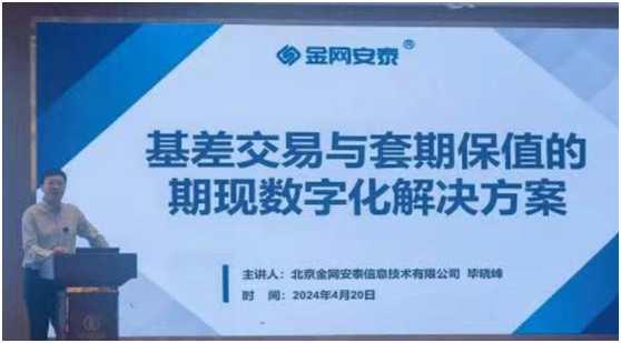 作为本次会议的受邀演讲嘉宾,金网安泰企业业务数字化部总监毕晓峰分享了“基差交易与套期保值的企业期现数字化解决方案”,让企业在复杂的国内外市场环境中,如何通过数字化手段优化业务运营,降低风险,提高收益。