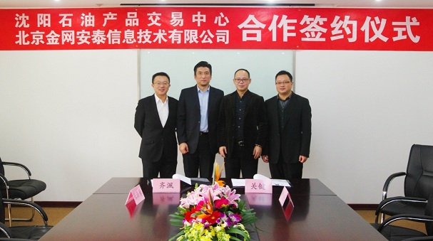 2015年12月24日,西方圣诞节前夕,凛冽的北风一扫多日以来围困京城的雾霾,云淡景明天光大好,沈阳石油产品交易中心与金网安泰信息技术有限公司合作签约仪式在金网安泰北京总部隆重举行,沈阳石油产品交易中心领导齐渢、张海勇,金网安泰关键先生与谢永峰先生参加了签约仪式。
