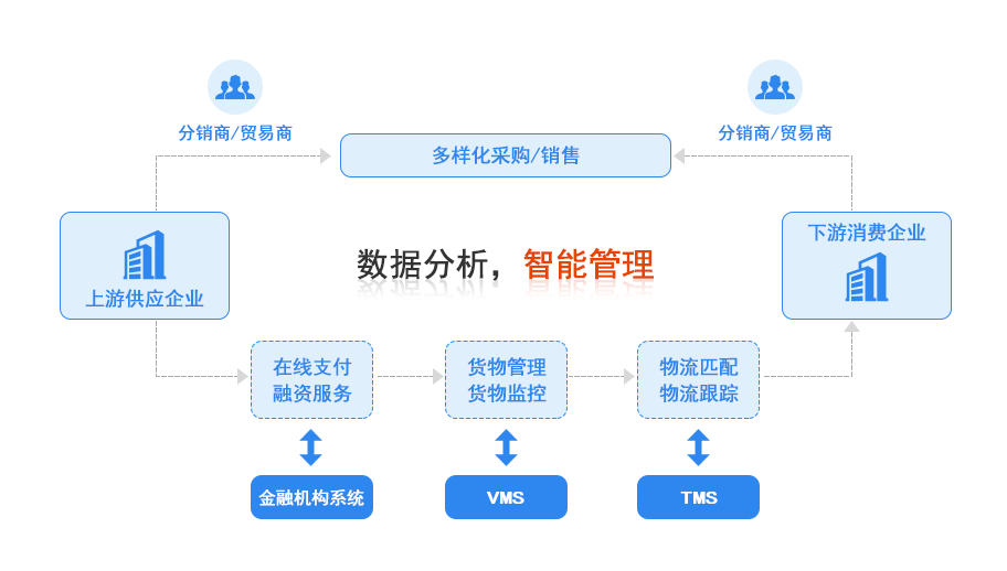 垂直电商为产业链上下游企业建立一个购销渠道,提供了多样化的贸易场景,优化购销流程,扩大销售规模、降低采购成本。
