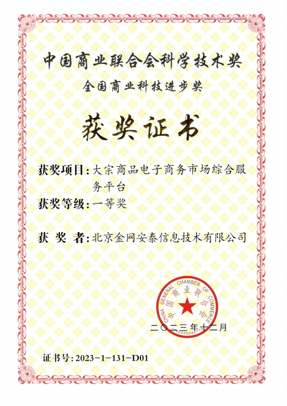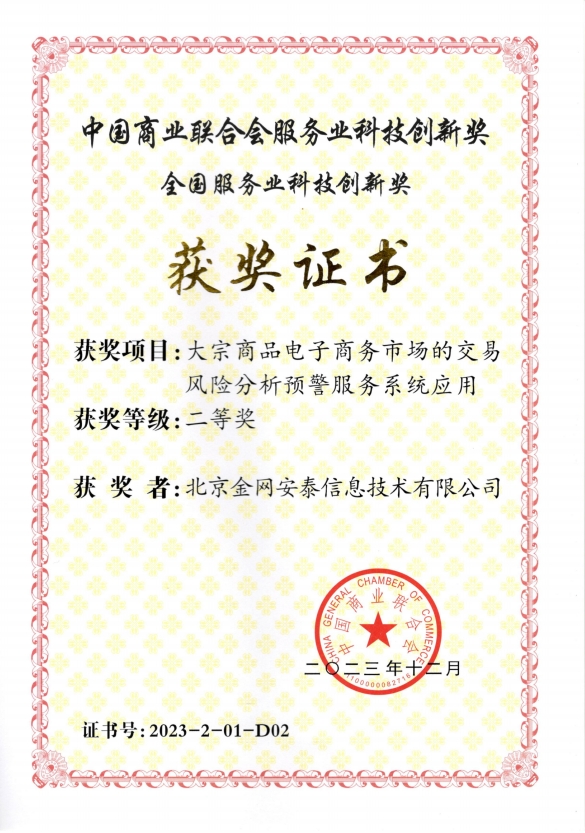 金网安泰信息技术有限公司(以下简称“金网安泰”)设计研发的“大宗商品电子商务市场综合服务平台”荣获2023年度中国商业联合会科学技术奖一等奖,“大宗商品电子商务市场的交易风险分析预警服务系统应用”项目,荣获第十五届中国商业联合会服务业科技创新奖二等奖。中国商业联合会科学技术奖旨在表彰在全国商业行业内科学研究、技术创新、成果有效推广及高新技术产业化方面取得杰出贡献的单位与个人,以促进商业行业的整体科技进步。服务业科技创新奖旨在通过表彰在服务业领域技术产品、管理制度、经营理念、流通秩序及基础设施等方面实现显著创新的组织和个人,进一步激发服务业企业的科学发展活力,共同推动服务业的繁荣与创新。