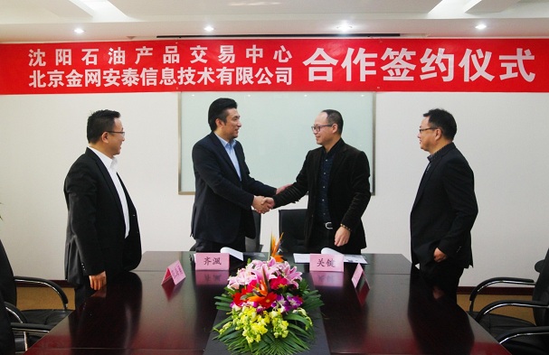 2015年12月24日,西方圣诞节前夕,凛冽的北风一扫多日以来围困京城的雾霾,云淡景明天光大好,沈阳石油产品交易中心与金网安泰信息技术有限公司合作签约仪式在金网安泰北京总部隆重举行,沈阳石油产品交易中心领导齐渢、张海勇,金网安泰关键先生与谢永峰先生参加了签约仪式。